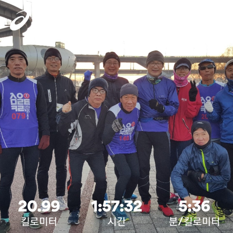신년초 가장 추운계절이지만 달리기에 최적의 날씨였습니다. 작년 마라톤대회성수기를 마치고 긴 휴식기 중 체력들이 저하되었을 것으로 생각되었는데 저는 헐떡거렸으나 모두들 잘달려서 기우에 불과 했던것 같습니다. 7기에 참여하시는 새로 참여하시는 많은 분들도 함께하여 활기찬 분위기여서 앞으로 기대되는 반달이 될것같습니다. 감사합니다..