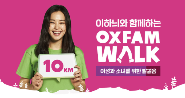 배우 이하늬와 함께하는 ‘옥스팜 워크’는 지구 반대편에서 살아가는 여성들이 깨끗한 물을 구하기 위해 매일같이 걷고 있는 ‘생존의 거리(10km)’를 간접적으로 체험해 보는 프로그램입니다. 순위를 매기는 스포츠 이벤트가 아닌 가난으로 고통받는 전 세계 사람들을 위한 기부 프로젝트로, 참가비 전액은 가난으로 고통받는 여성과 소녀들을 위한 보호 프로그램을 비롯하여 전 세계 도움이 필요한 긴급구호 현장 복구를 위해 사용됩니다.