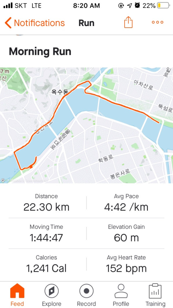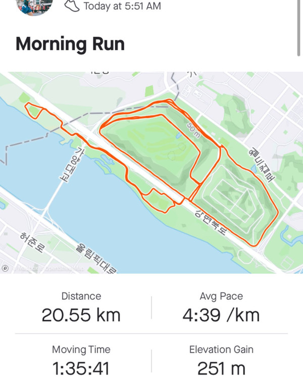 한 번에 42.195km 뛰었으면 좋았겠지만 훈련량도 그렇고 몸 상태가 그 정도에 미치지는 못하는 것 같아 2회에 걸쳐 나누어 뛰었습니다.